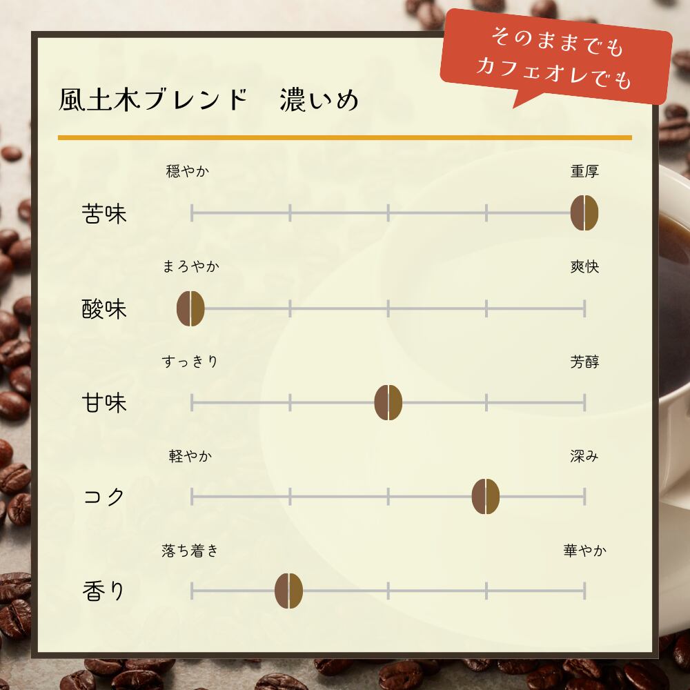 このコーヒーは、リラックスタイムやおもてなしの場面だけでなく、日常の一杯としてもぴったりです。心地よい風味が、あなたの心を和ませ、特別なひとときを演出します。ぜひ、風土木ブレンドで日常に少しの贅沢を加えてみてはいかがでしょう。