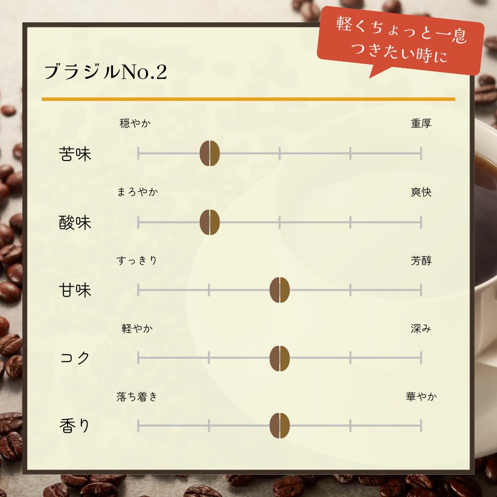 ブラジルNo2 は、バランスの良い風味が特徴のコーヒー豆です。ブラジルの豊かな大地で育ったコーヒー豆は、穏やかな口当たりと豊かな香りが楽しめます。コクがありながらも後味がすっきりとした一杯をお楽しみいただけます。