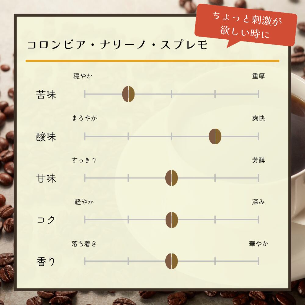 コーヒー愛好家から絶大な支持を受けるこの一品は、朝食の楽しみ、仕事の休憩タイム、友人との会話の共有など、あらゆるシーンでお楽しみいただけます。是非、特別なひとときにコロンビア ナリーノ スプレモをお試しください。