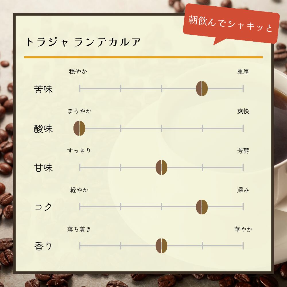 香り豊かでコクがあり、なめらかですっきりとした後味、ナッツのような風味をを感じられます。まろやかで甘みのある味わい、さわやかで上品な苦みが、朝の目覚めや仕事の合間、大切な人との時間をより特別なものに変えてくれます。