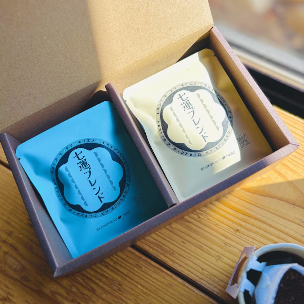 那珂の民話にちなんだ「七運ブレンド」を、手軽なドリップパックに仕立てました。 ちょっとしたご挨拶や、日頃の感謝を伝える手土産にちょうど良いサイズを、専用の箱に詰めてお運びします。