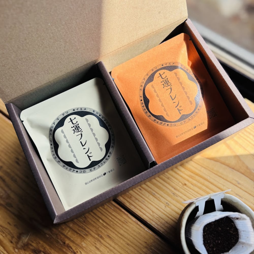 那珂の民話にちなんだ「七運ブレンド」を、手軽なドリップパックに仕立てました。 お祝いや内祝いなど、大切な節目にふさわしい満足感のあるセットです。