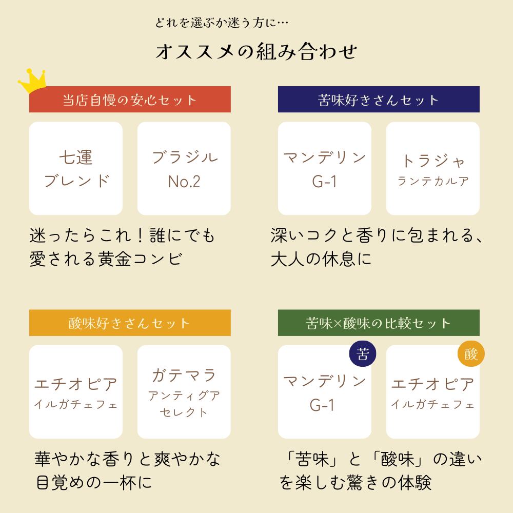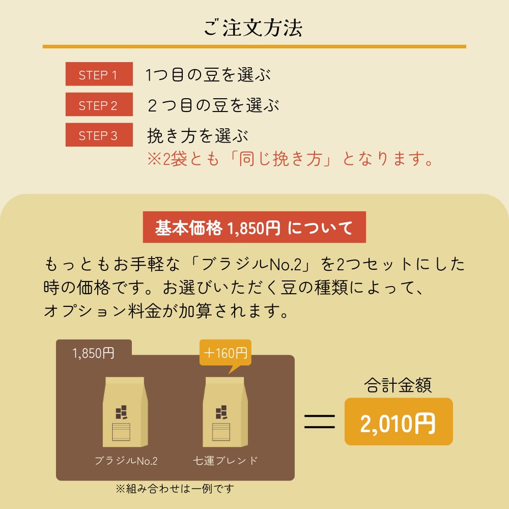 本商品の基本価格 1,850円は、「ブラジルNo.2(200g)」を2袋お選びいただいた際の価格です。(箱代を含む)